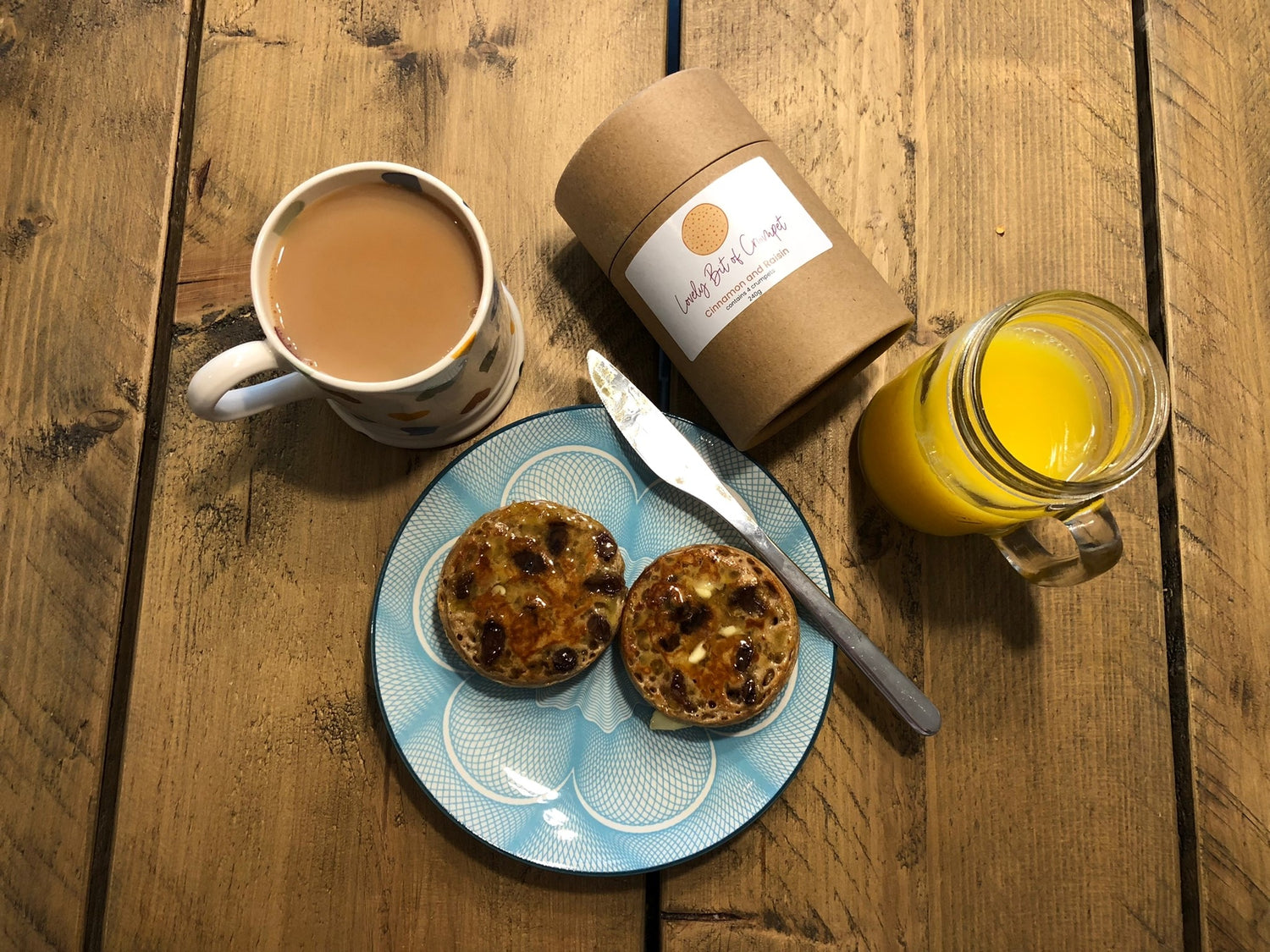 "Cinnamon and Raisin" crumpets are scattered with plump raisins and infused with notes of cinnamon, orange and vanilla. We enjoy these crumpets with butter and marmalade, a dollop of crème fraiche, fresh berries and a drizzle of honey, or made into French toast with caramelised bananas - divine.